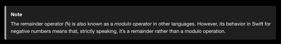 ๋ฐ๋ผ์, Swift๋ Modulo Operator๊ฐ ์๋ Remainder Operator๋ก ๋ถ๋ฆฌ๋ ๊ฒ์ ๋๋ค.