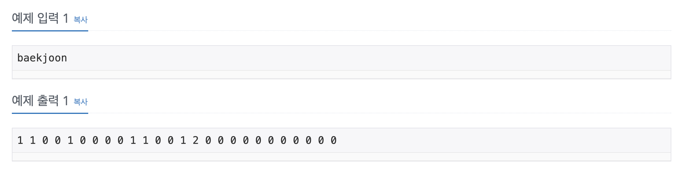 ๋จ์ด์ ํฌํจ๋์ด ์๋ a์ ๊ฐ์, b์ ๊ฐ์, …, z์ ๊ฐ์๋ฅผ ๊ณต๋ฐฑ์ผ๋ก ๊ตฌ๋ถํด์ ์ถ๋ ฅํ๋ค.