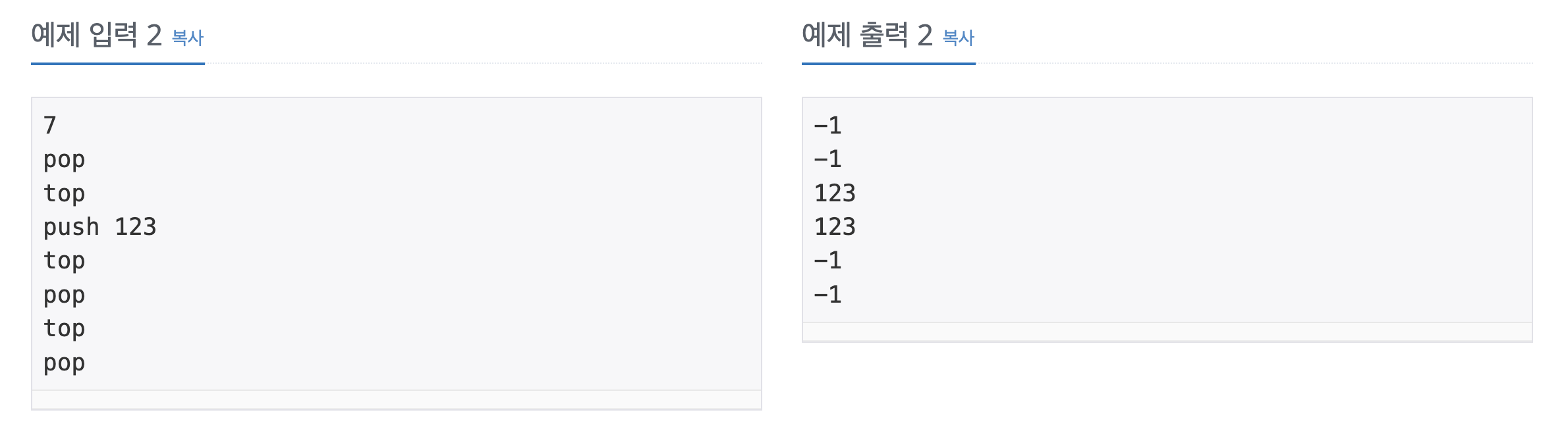 - top: ์คํ์ ๊ฐ์ฅ ์์ ์๋ ์ ์๋ฅผ ์ถ๋ ฅํ๋ค. ๋ง์ฝ ์คํ์ ๋ค์ด์๋ ์ ์๊ฐ ์๋ ๊ฒฝ์ฐ์๋ -1์ ์ถ๋ ฅํ๋ค.