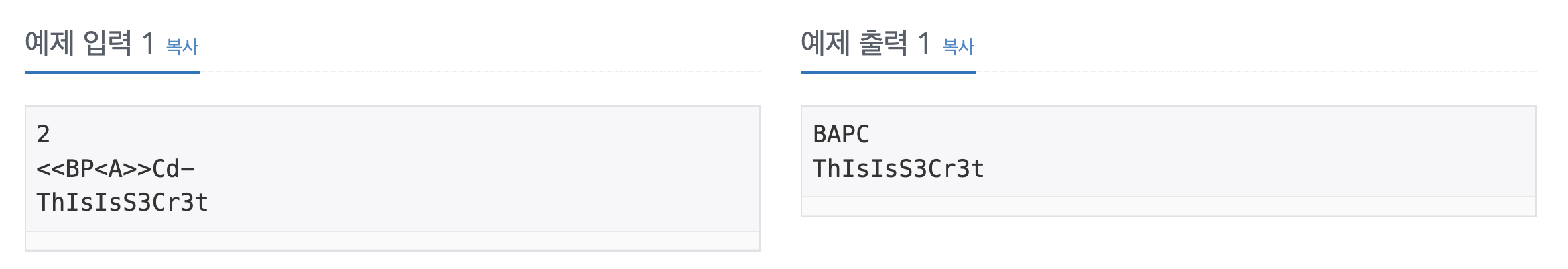 ์ฒซ์งธ ์ค์ ํ ์คํธ ์ผ์ด์ค์ ๊ฐ์๊ฐ ์ฃผ์ด์ง๋ค. ๊ฐ ํ ์คํธ ์ผ์ด์ค๋ ํ์ค๋ก ์ด๋ฃจ์ด์ ธ ์๊ณ , ๊ฐ์ฐ์ด๊ฐ ์ ๋ ฅํ ์์๋๋ก ๊ธธ์ด๊ฐ L์ธ ๋ฌธ์์ด์ด ์ฃผ์ด์ง๋ค. (1 ≤ L ≤ 1,000,000) ๊ฐ์ฐ์ด๊ฐ ๋ฐฑ์คํ์ด์ค๋ฅผ ์ ๋ ฅํ๋ค๋ฉด, '-'๊ฐ ์ฃผ์ด์ง๋ค. ์ด๋ ์ปค์์ ๋ฐ๋ก ์์ ๊ธ์๊ฐ ์กด์ฌํ๋ค๋ฉด, ๊ทธ ๊ธ์๋ฅผ ์ง์ด๋ค. ํ์ดํ์ ์ ๋ ฅ์ '<'์ '>'๋ก ์ฃผ์ด์ง๋ค. ์ด๋๋ ์ปค์์ ์์น๋ฅผ ์์ง์ผ ์ ์๋ค๋ฉด, ์ผ์ชฝ ๋๋ ์ค๋ฅธ์ชฝ์ผ๋ก 1๋งํผ ์์ง์ธ๋ค. ๋๋จธ์ง ๋ฌธ์๋ ๋น๋ฐ๋ฒํธ์ ์ผ๋ถ์ด๋ค. ๋ฌผ๋ก , ๋์ค์ ๋ฐฑ์คํ์ด์ค๋ฅผ ํตํด์ ์ง์ธ ์๋ ์๋ค. ๋ง์ฝ ์ปค์์ ์์น๊ฐ ์ค์ ๋ง์ง๋ง์ด ์๋๋ผ๋ฉด, ์ปค์ ๋ฐ ์ปค์ ์ค๋ฅธ์ชฝ์ ์๋ ๋ชจ๋ ๋ฌธ์๋ ์ค๋ฅธ์ชฝ์ผ๋ก ํ ์นธ ์ด๋ํ๋ค.