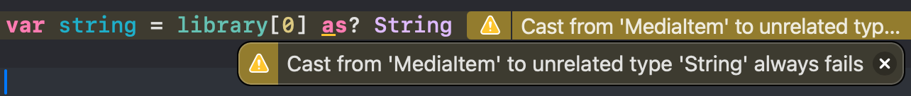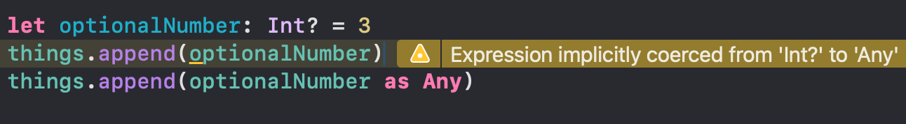 Any νμ μ΄ κΈ°λλλ κ³³μ μ΅μ λ κ°μ μ¬μ©νλ©΄ κ²½κ³ κ° λ°μν©λλ€. μ΄ κ²½μ°, as μ°μ°μλ₯Ό μ¬μ©νμ¬ Any νμ μΌλ‘ μΊμ€ν ν΄μ£Όμ΄μΌ ν©λλ€.